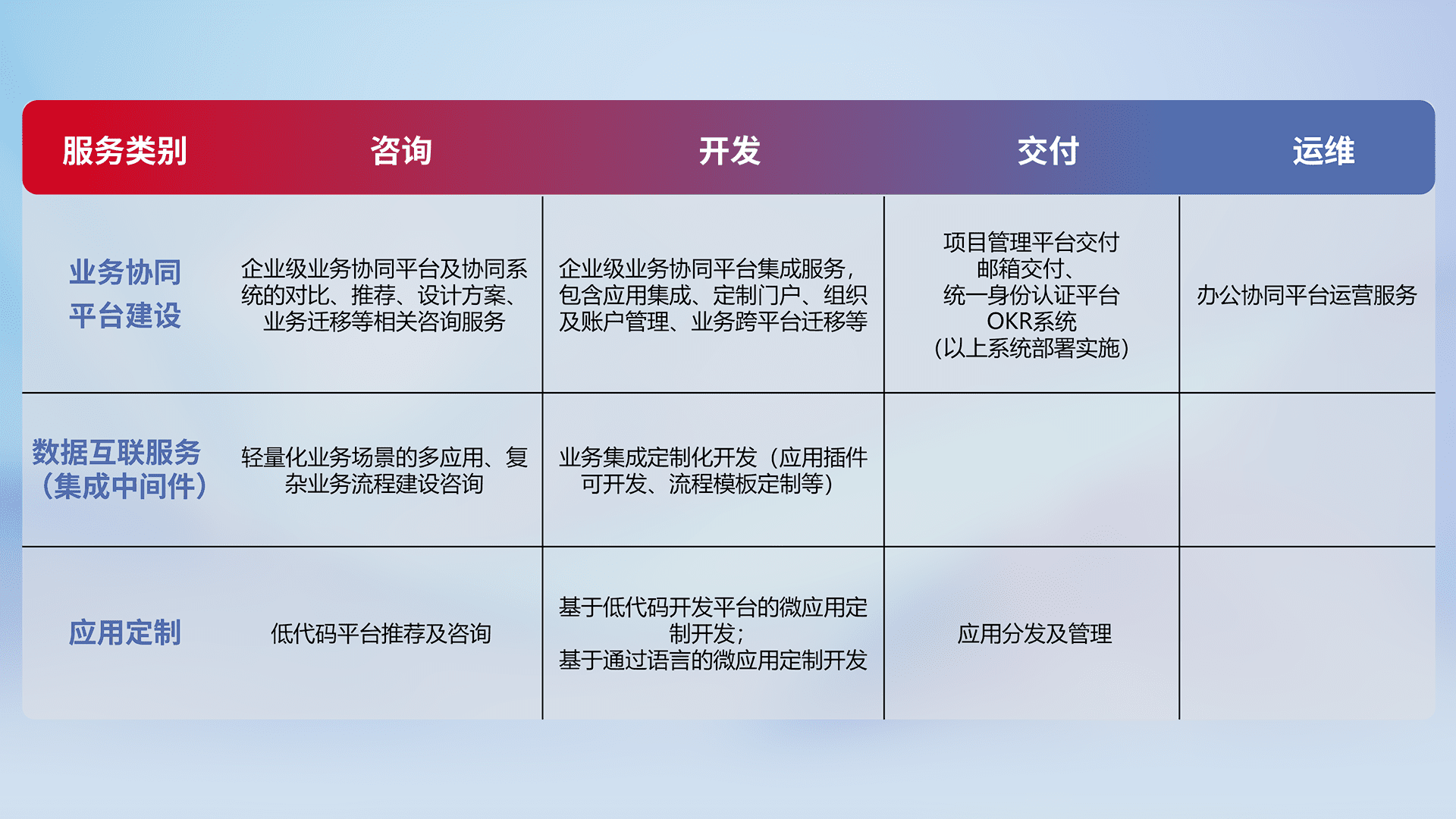 针对钉钉、、、企微、、、IDaas等平台级产品提供产品的规划、、、方案、、、、交付、、、定制化开发等服务,,,,实现如统一协同办公、、、、智能客户服务、、、、混合会议管理、、智能数据查询、、等业务场景,,实现数字化转型。。