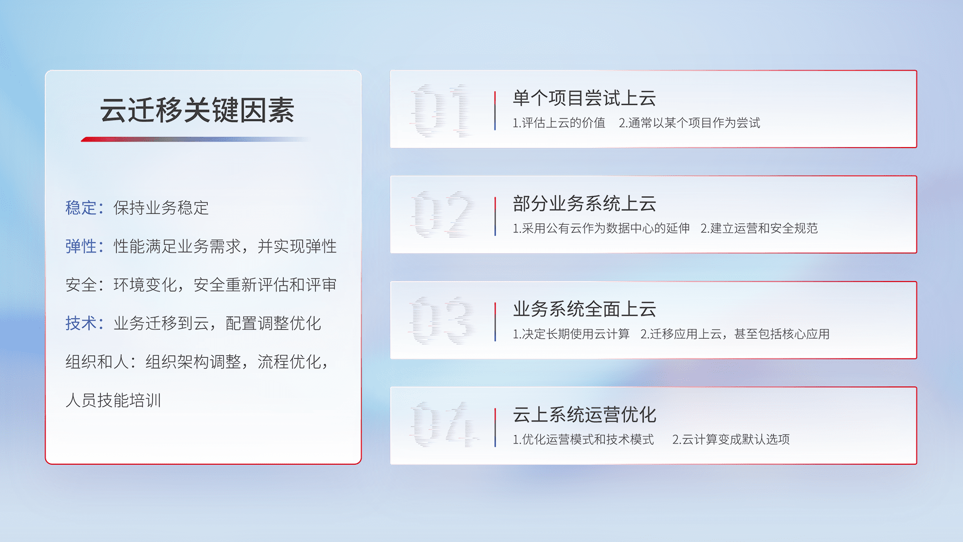 结合实际业务,,,从规划设计、、云平台选型、、云原生改造、、、、数据迁移、、、集成交付,,迁移全过程为客户识别最佳上云路径,,做好风险识别管理,,,,设计网络架构、、、身份权限、、、安全审计合规、、、操作审计、、、日志审计、、、、监控告警策略、、、、多站点容灾设计等,,对云上基础设施进行整体规划,,提升IT治理水平,,以满足弹性、、、、高可用、、、高性能的需求。。