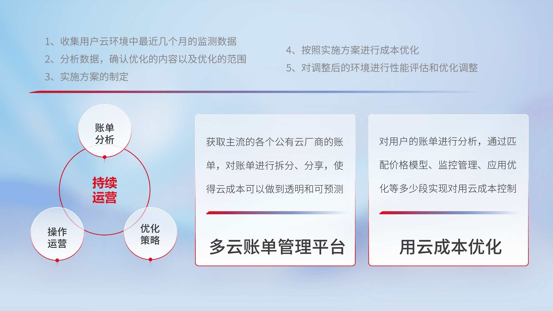 通过多云纳管,,,以统一的资源数据模型把客户的云资源进行抽象和封装,,进而实现对多云资源的统一操作,,保障云资源管理的可靠性、、稳定性与可用性。。。。量身定制化运维内容,,,,配置、、、开发运维、、、、补丁管理、、备份、、、、监控、、、、认证和访问管理、、、审计和日常巡检等,,,保障在用云过程中的可靠度,,,稳定度以及高可用率。。。